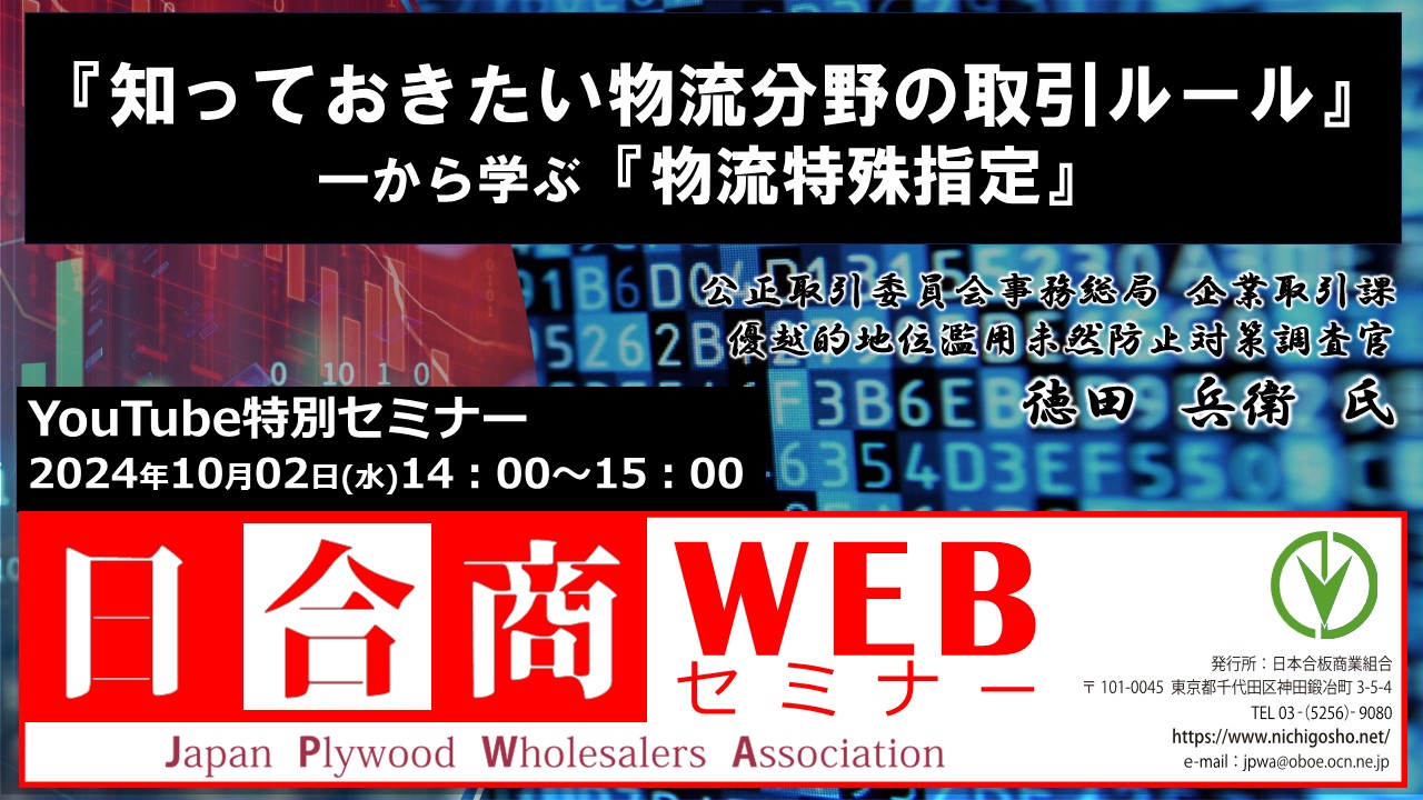 我々合板・建材の卸売業において、配送業務を継続的に物流事業者に委託することが多々ありますが、この様な場合、荷主と物流事業者の資本金の関係により独占禁止法上の「物流特殊指定」が適用される場合があります。今回のセミナーでは、「物流特殊規定」とはどのようなルールになるのか等を、公正取引委員会より講師を迎え解説していただきます。