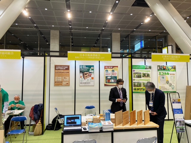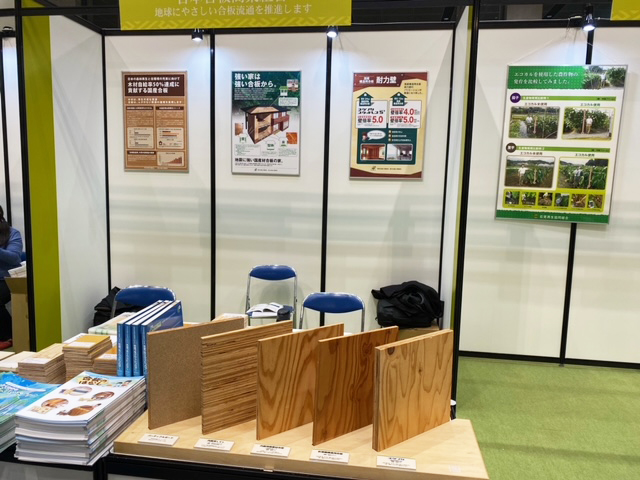 今回、日合商は東京合板工業組合及び東北合板工業組合のご協力をいただきリアルの展示を行い、来場者に合板の説明や合法木材供給事業者認定団体としての環境への取組などPR活動を行いました。