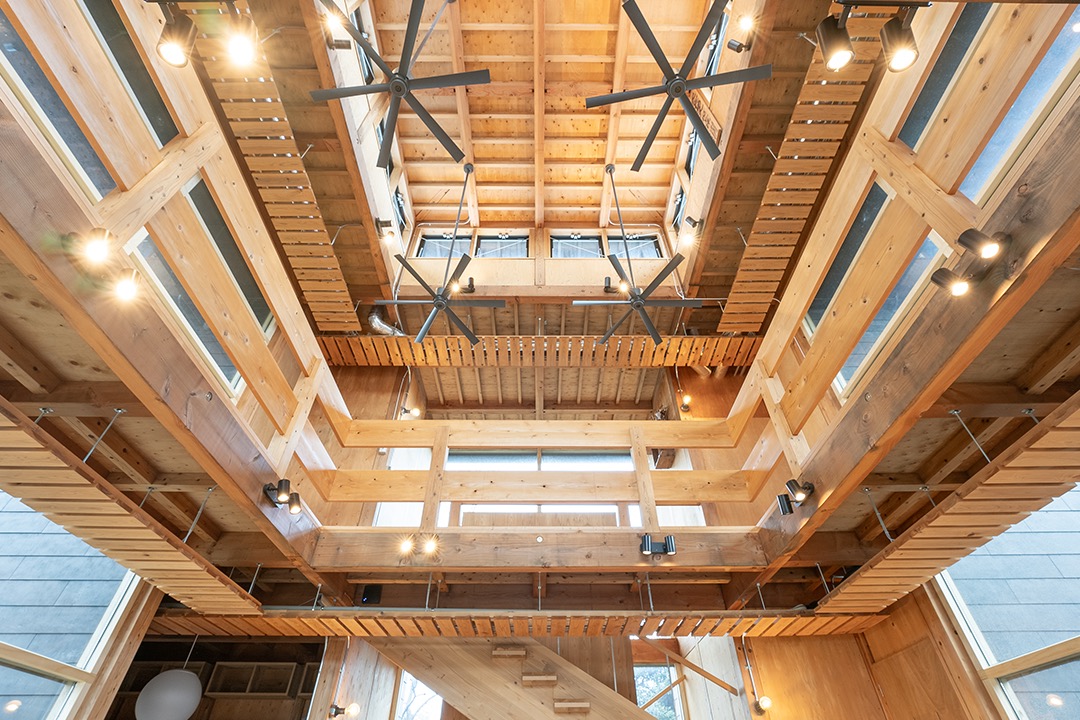 壱岐市郷ノ浦町に2023年1月竣工した睦モクヨンビルは、島内の設計コンサルタント会社が施主となり、自ら設計した無垢製材あらわし木造4階建ての複合施設です。